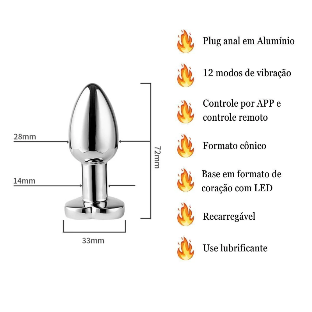 O Plug P tem tamanho de 7,2x3,3x2,8cm. O melhor desse plug é que ele funciona com controle remoto e também com aplicativo em 12 modos de vibração diferentes!